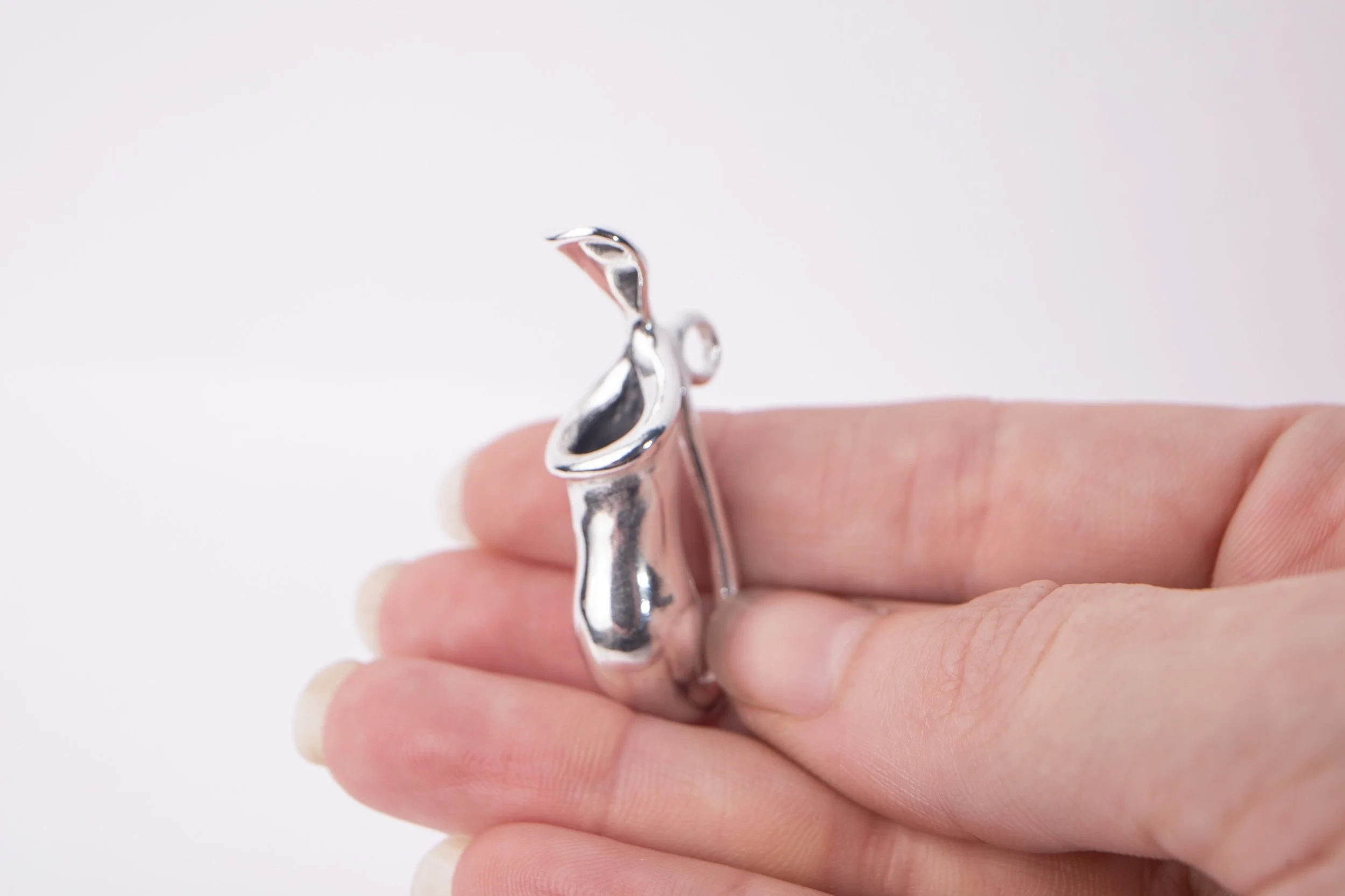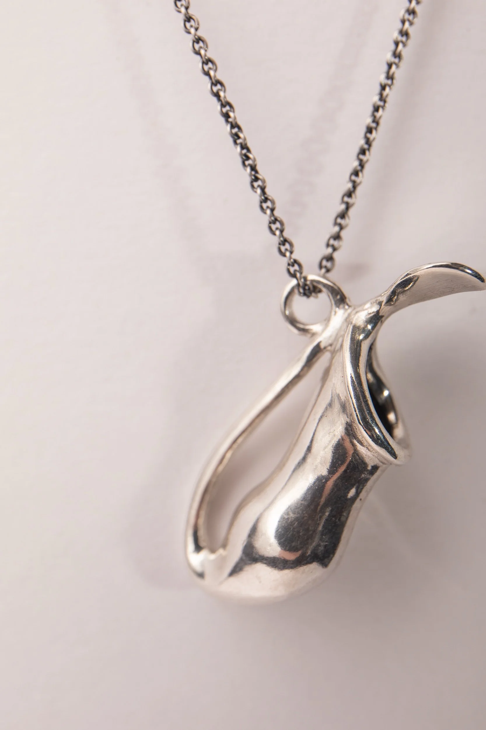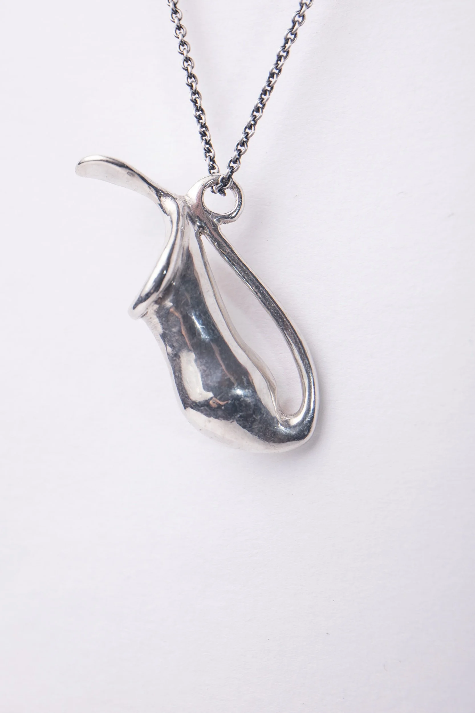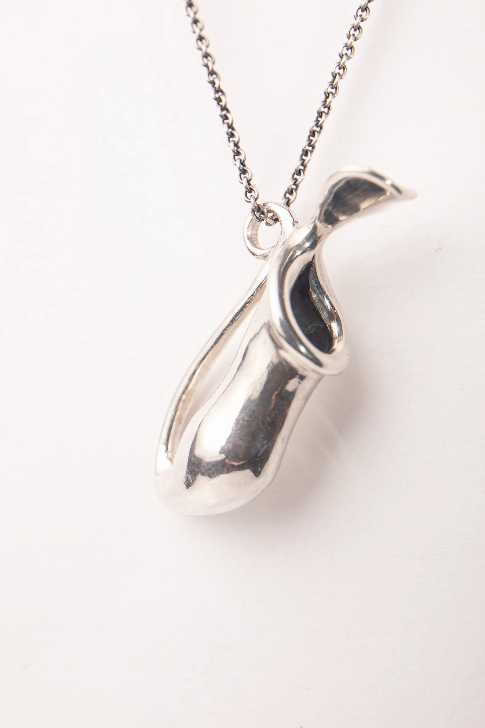 This medium sized pitcher pendant hangs from a 18 inch silver chain.