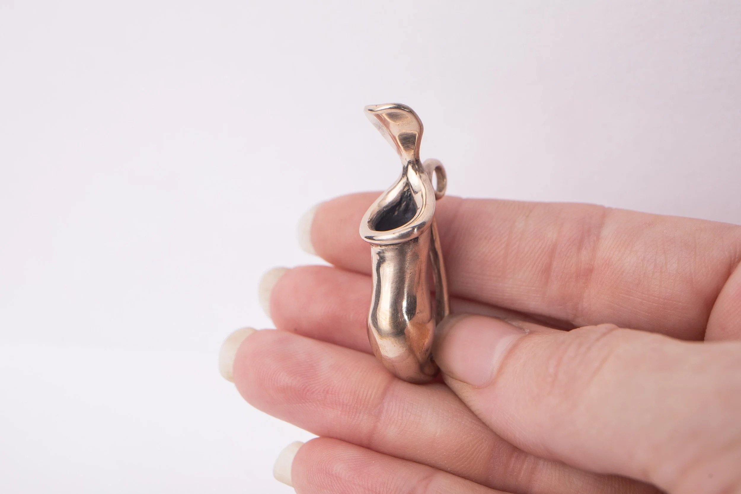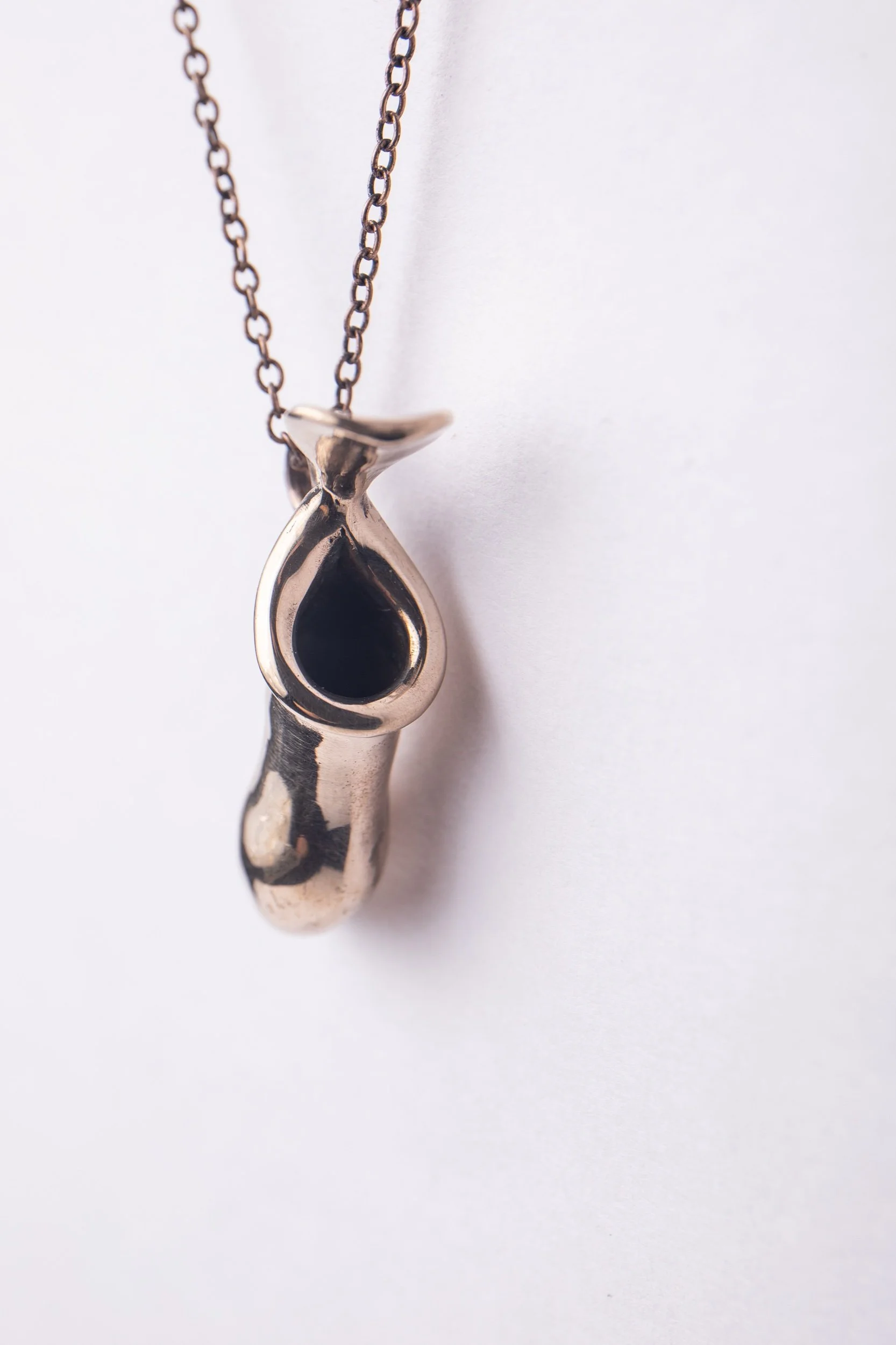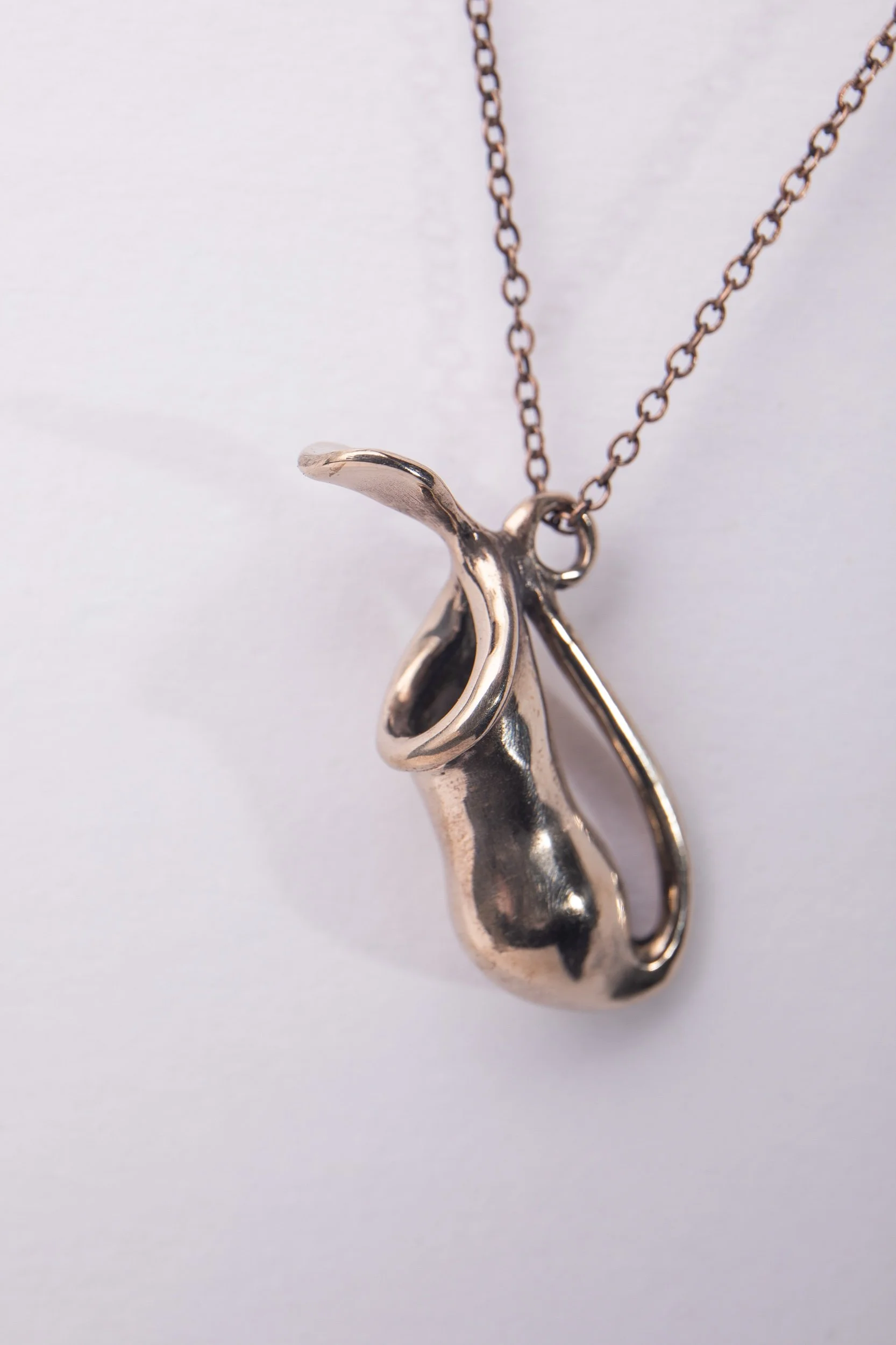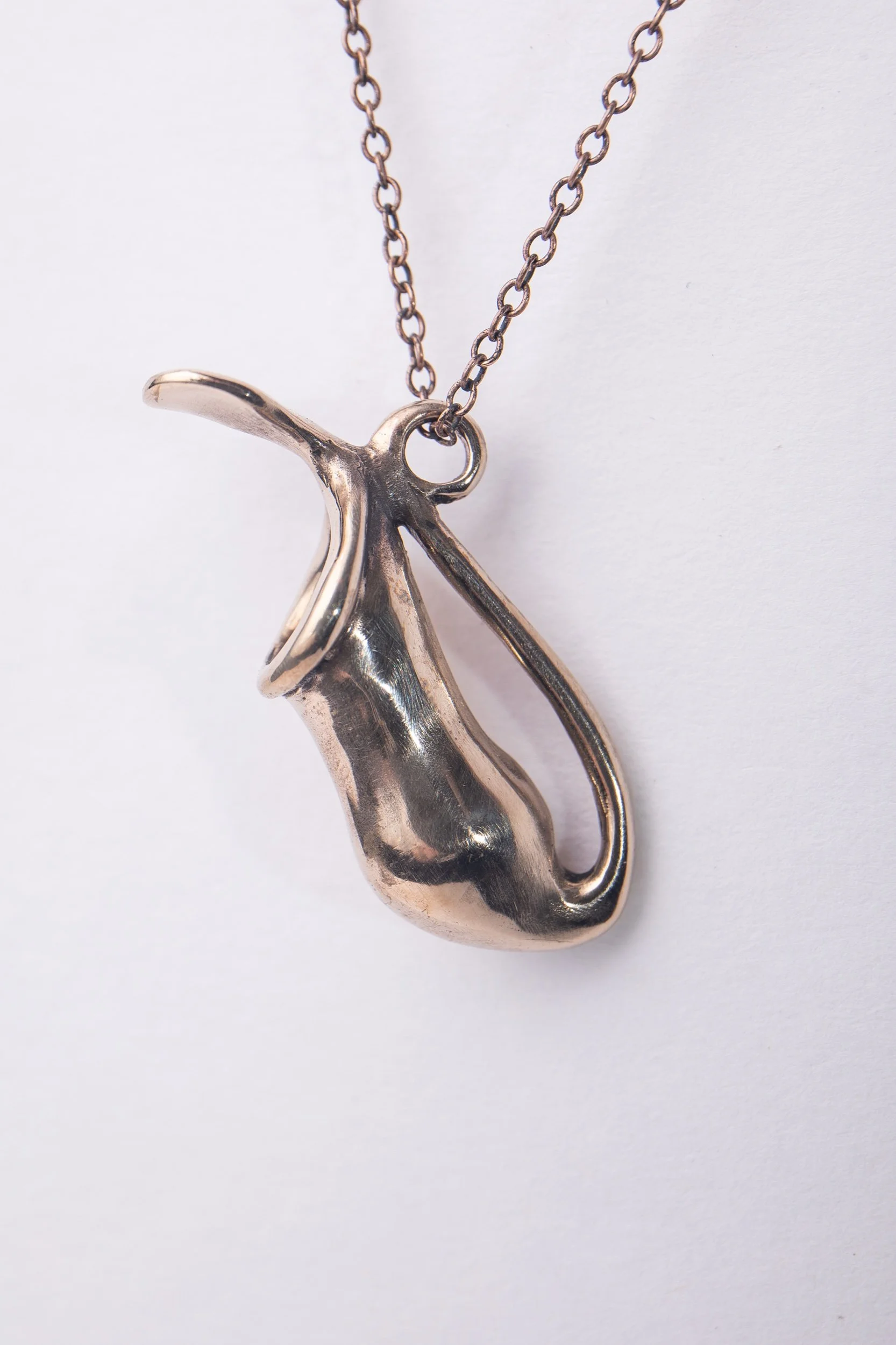 This medium sized pitcher pendant hangs from a 18 inch bronze chain.